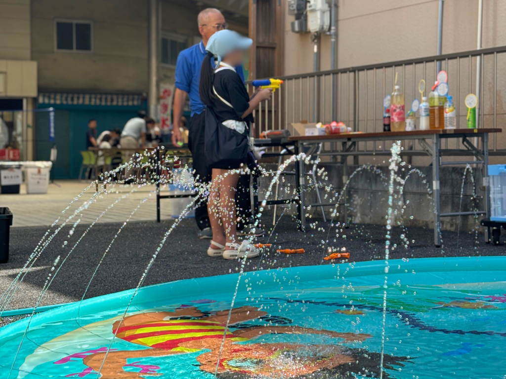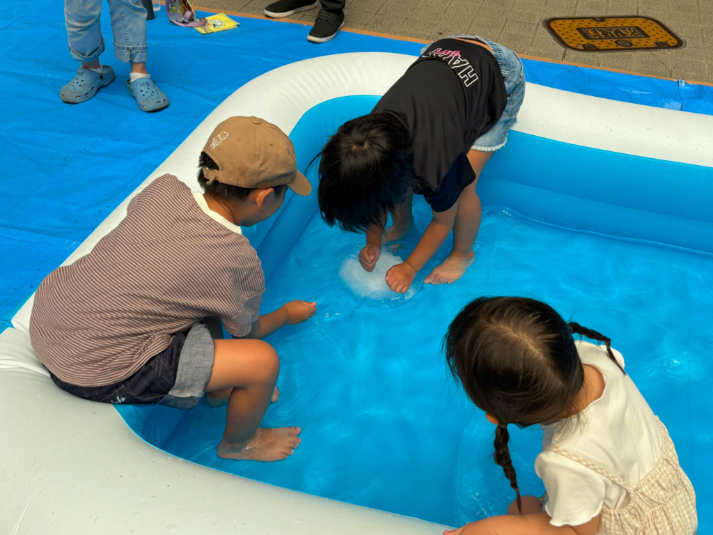 この時期らしい夏のブースとしては、水風船のヨーヨー釣り、水鉄砲を使いポイを的に見立てた射的、ひんや~り冷たい氷プールや、おニューの噴水マットで水遊びを楽しみました。