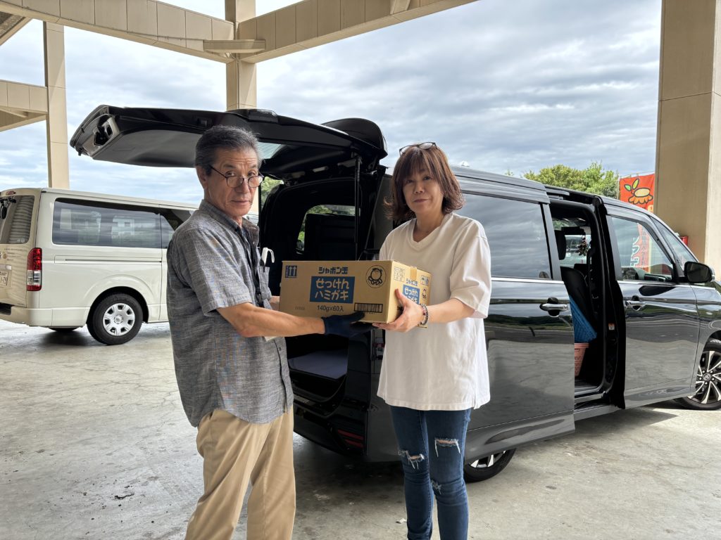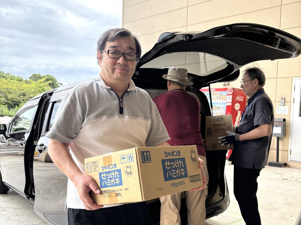 今回の配布会では、シャボン玉石けん株式会社から寄贈された「シャボン玉せっけんハミガキ」、「シャボン玉薬用せっけんハミガキ」もお渡ししました。