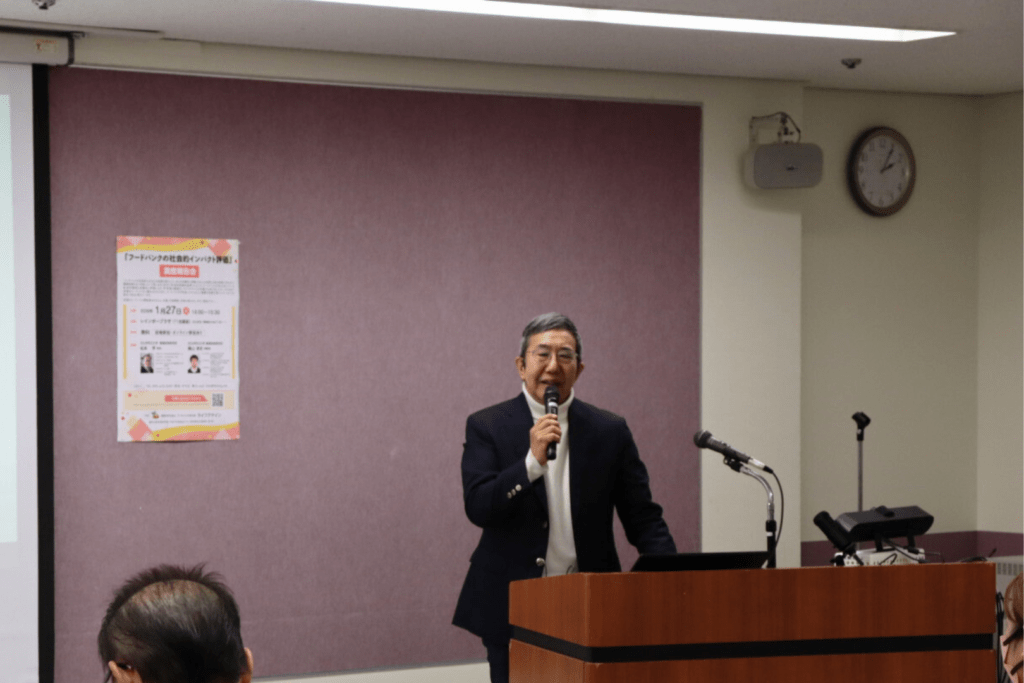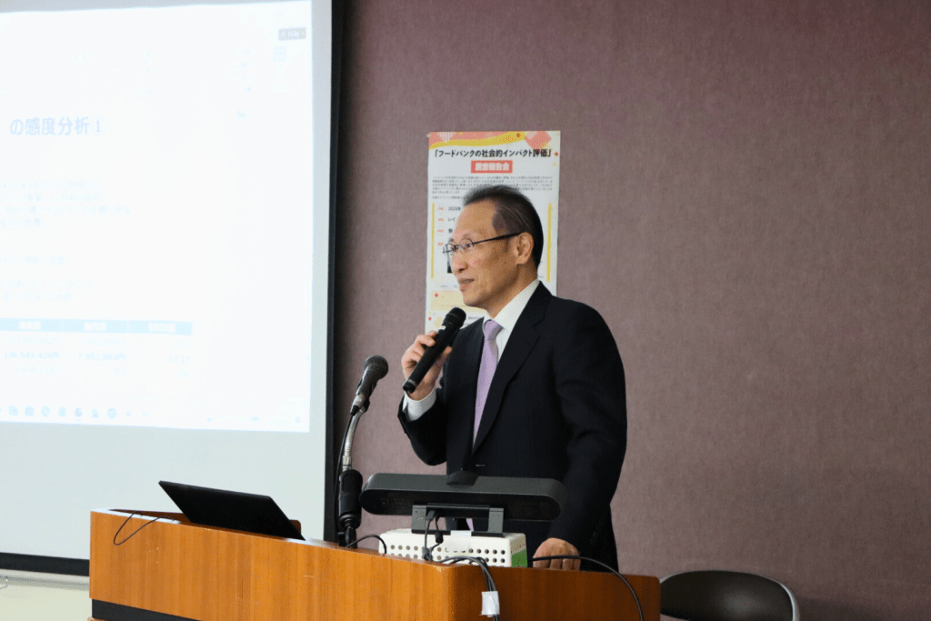 これは「フードバンクが社会的にどのような役割を果たしているかを定量的に評価」することを目的に、北九州市立大学環境技術研究所の松本亨教授を中心に2024年度に行われた調査の報告会です。